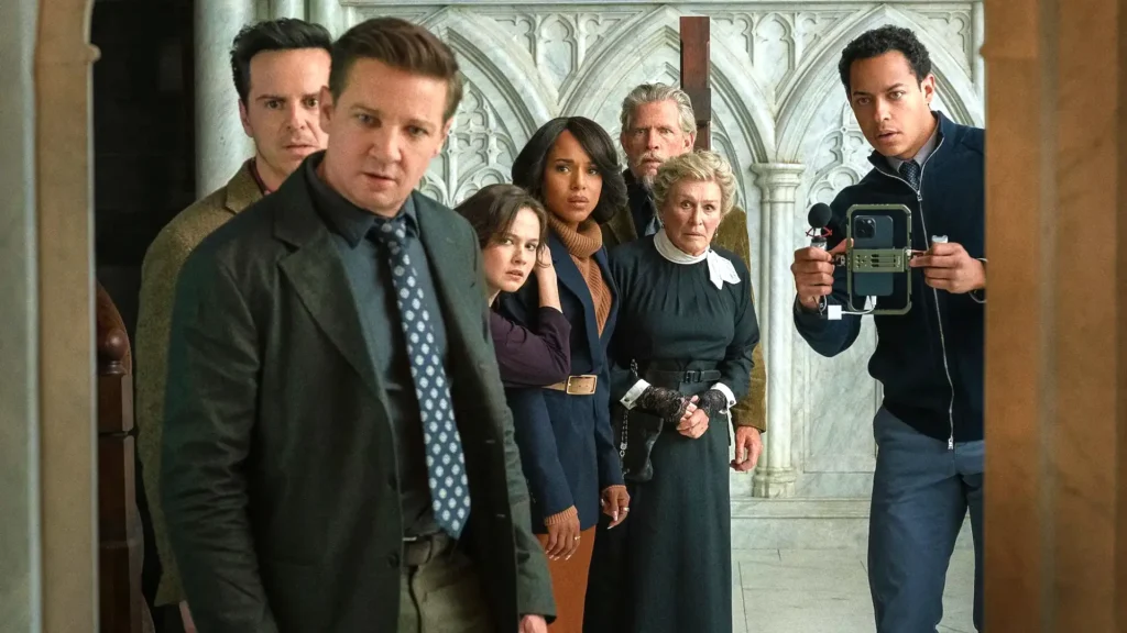 Benoit Blanc enfrenta uma comunidade religiosa fechada, enquanto Martha Delacroix, vivida por Glenn Close, surge como peça-chave do quebra-cabeça. A lealdade da personagem à igreja adiciona camadas morais ao suspense.