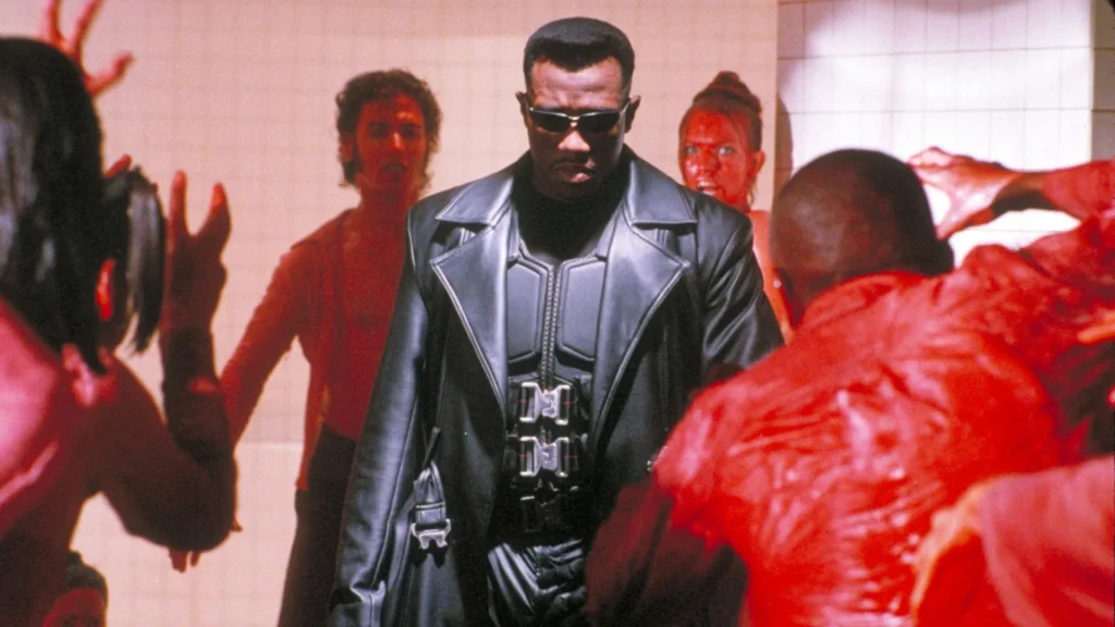 Logo de cara, o filme apresenta um universo clandestino onde vampiros festejam sob um chuveiro de sangue. A câmera circula sem pressa pelos dançarinos, cria tensão com ruídos eletrônicos e só então revela Blade, imaculado, empunhando a katana. Essa imagem cristaliza o herói como um forasteiro dentro daquele mundo sombrio.