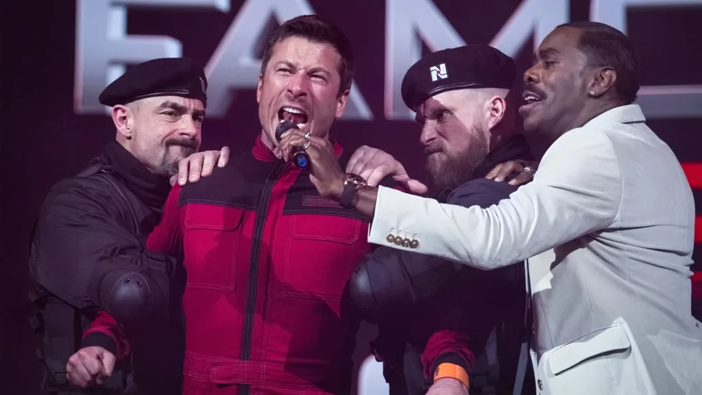 A cena em questão mostra Ben Richards (Powell) sendo apresentado, ainda algemado, ao público do mortal game show comandado por Bobby T. (Domingo). Ao perceber a energia dos figurantes, os dois atores extrapolaram falas, gestos e provocações, transformando o set em um verdadeiro espetáculo improvisado.