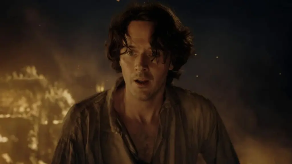 A cena ganha ainda mais peso quando Jamie, mesmo distante em Fraser’s Ridge, desperta subitamente sentindo que algo terrível aconteceu, reforçando a forte conexão emocional entre os personagens.